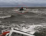 To børn var drevet ud fra stranden i en gummibåd. Det udvikler sig på den måde, at moren også hopper i vandet og svømmer ud mod dem.