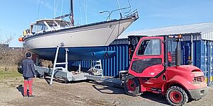 Princess 50 hævet ved Rødvig efter den ramte stenmole - nu er den i Dragør efter tur på pram