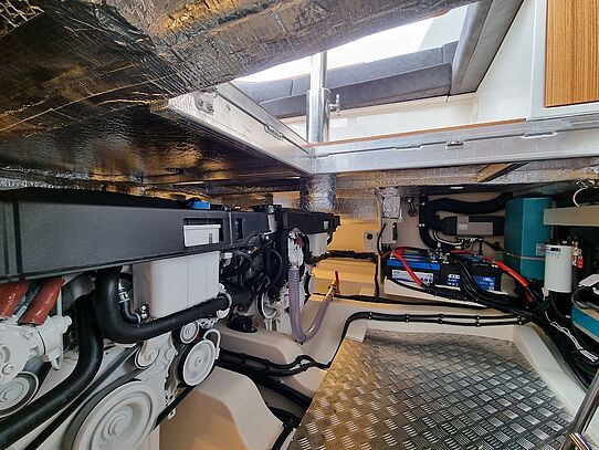 Vi måtte lukke gik og åbne skydedøren agter i glas med aluminium og det gjaldt også skydetaget alt efter hvor varmt det var. Skydetaget, der er ret bredt, giver en cabriolet-fornemmelse om bord, kører manuelt. Men den er let at åbne og lukke, og importør og eneforhandler Kasper Reese fra Reese Marin, fortæller at det er en pointe, at den er manuel, da den dermed er mere holdbar, end havde den været elektro hydraulisk.