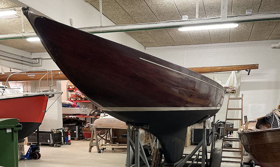 Det særlige ved den meget velholdte båd er, at den i sin tid blev bygget i en dagligstue i Ramsherred i Rudkøbing og bakset ud gennem et trefags-vindue.