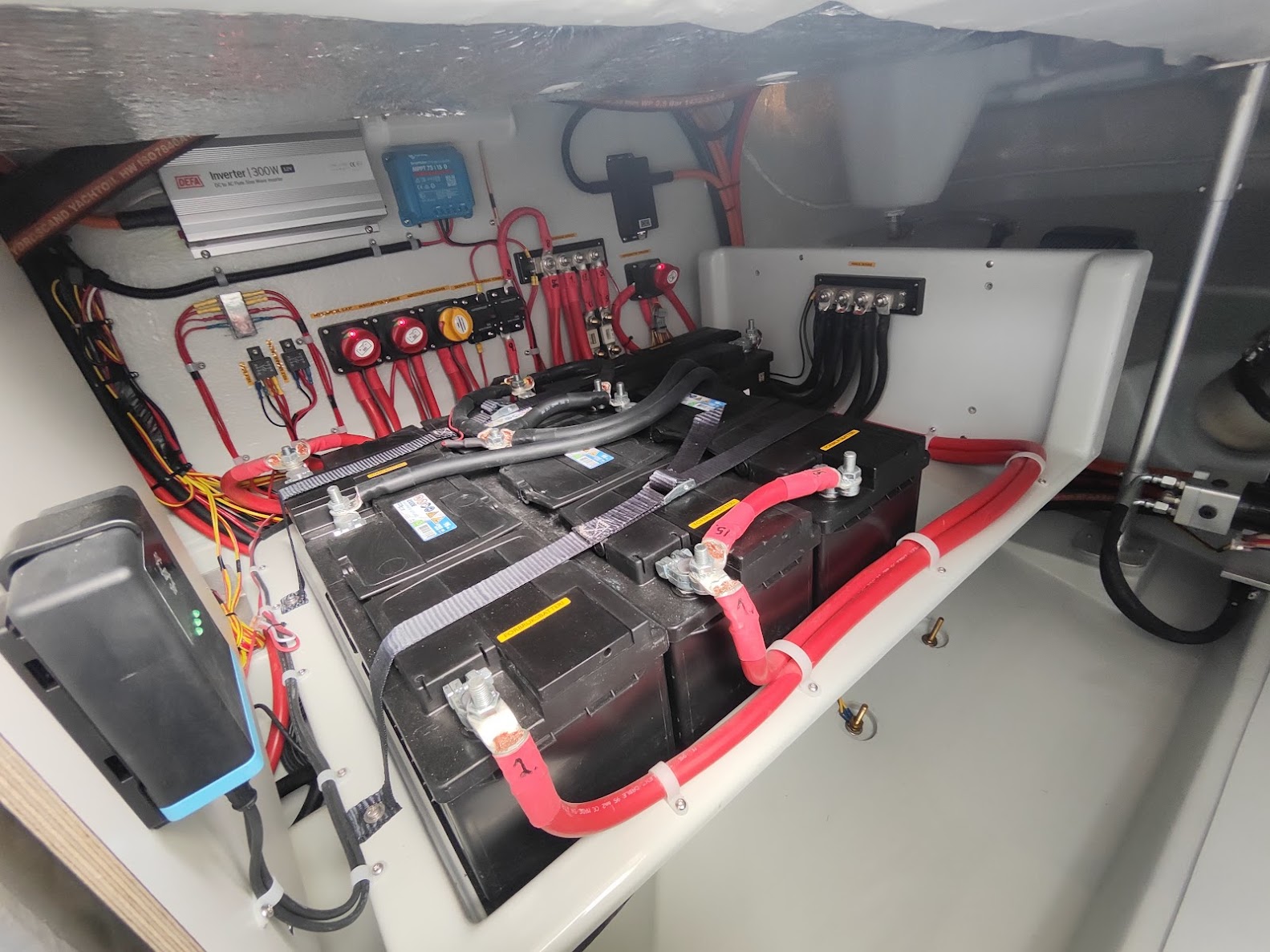 Tre kahytter: forkahyt med lavere seng og større vinduer, midtskibs dobbeltkabine (140 cm bred køje) og agterkabin med langskibs enkeltseng.