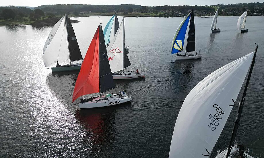 Ved broen lå han side om side med de to stærke tyske Dehler 30’ere Play Harder (Max Gurgel) og Powerplay (Bjarne Lorenzen), mens Jynx, en Esse 850, førte small-klassen.