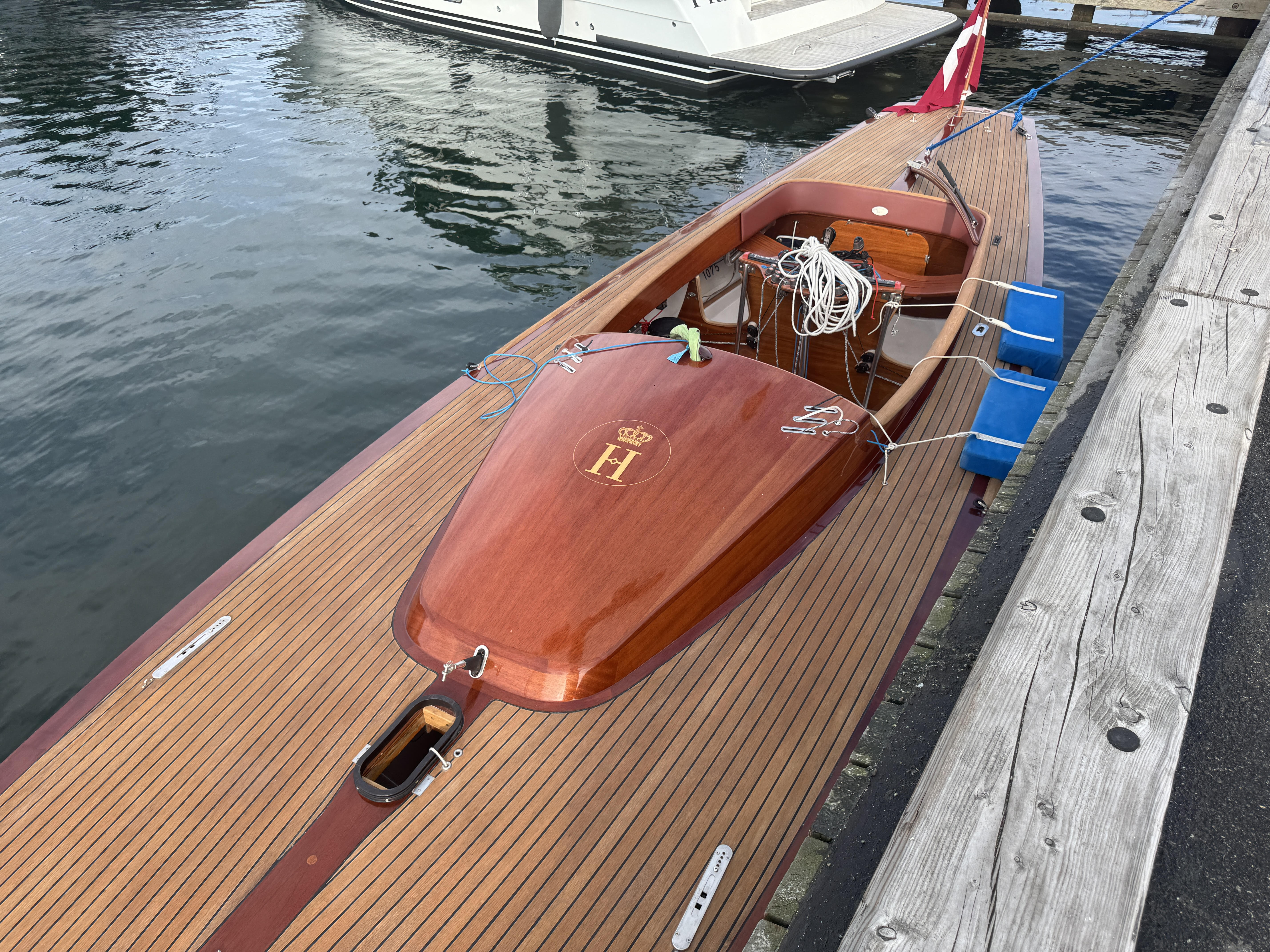 Båden kombinerer et solidt glasfiberskrog med dæk i teak og et ruf og cockpit i blanklakeret mahogni – alt sammen udført med den omhu og æstetik, som Børresen er kendt for. En elegant detalje er Prins Henriks personlige monogram, diskret indlagt i mahognien på ruffet.
