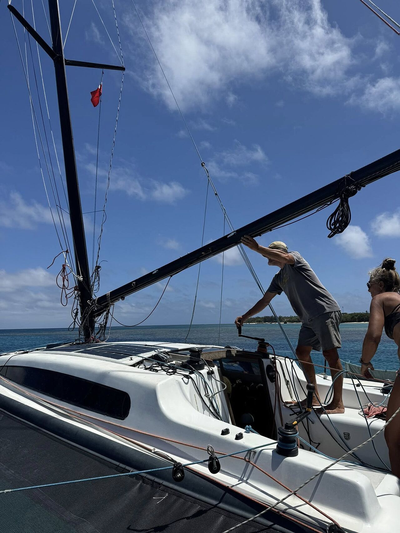 Efter rejsningen gik Jan og Annette i gang med at sætte sejlene på igen. Planen er nu at fortsætte sejladsen mod New Zealand.