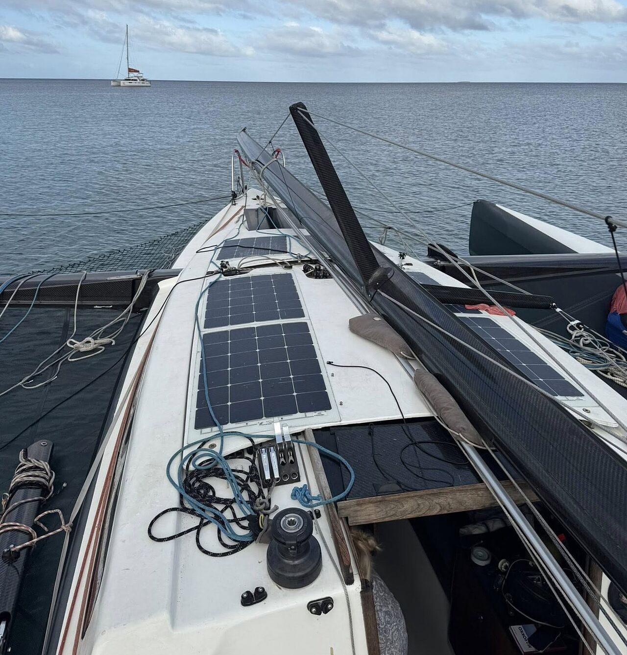 Derefter gik parret i gang med at bjerge sejlene og trække masten på tværs af båden for at sikre den. Med Black Marlins elmotor i økonomifart sejlede de mod ankerpladsen og kunne efter seks timer droppe ankeret i måneskin.