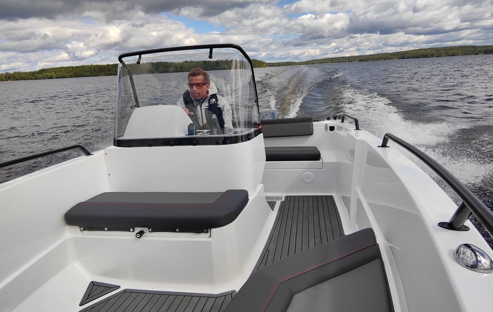 Den høje vindskærm dækker godt for vinden, dog ikke helt i siderne. Styrepladsen består af en enkel bænk uden rygstøtte – fint til kortere ture, men ikke ideelt til timevis på søen.