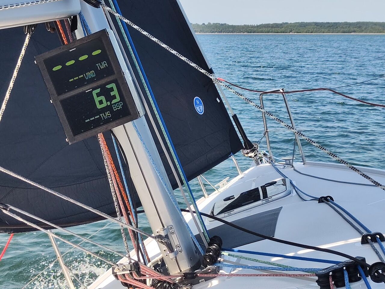 Under forhold på 5-6 m/sek viste båden et markant højt fartpotentiale og imponerende kontrol. Selv uden planing lå farten på 6-6,5 knob på kryds og 8 knob på læns.