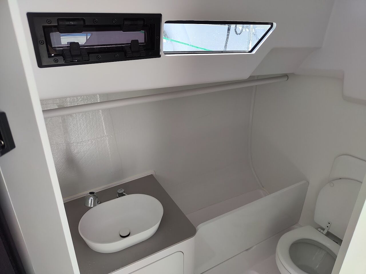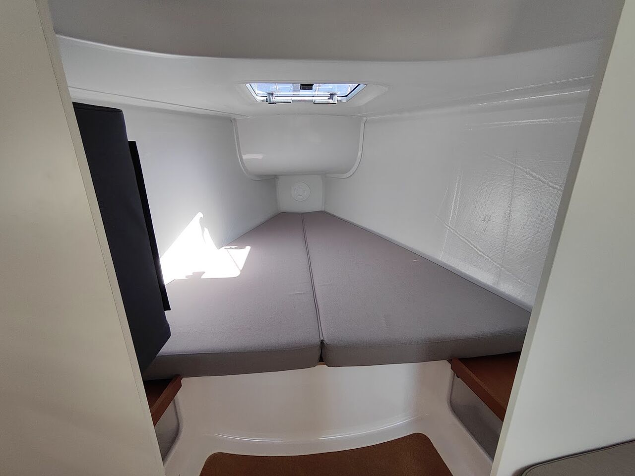 Ståhøjden i nedgangen er 1,81 meter, og salonen har foldbare ryglæn, der giver ekstra bredde ved sovebrug. Der er god ventilation via store luger og vinduer i fribordet. Efter et skridt ind i kahytten reduceres ståhøjden til cirka 1,7 meter. Det trækker lidt ned, men rumfølelsen er fin nok, også med den åbne forkahyt, og indretningen er hyggelig, mener vi på minbaad.dk.