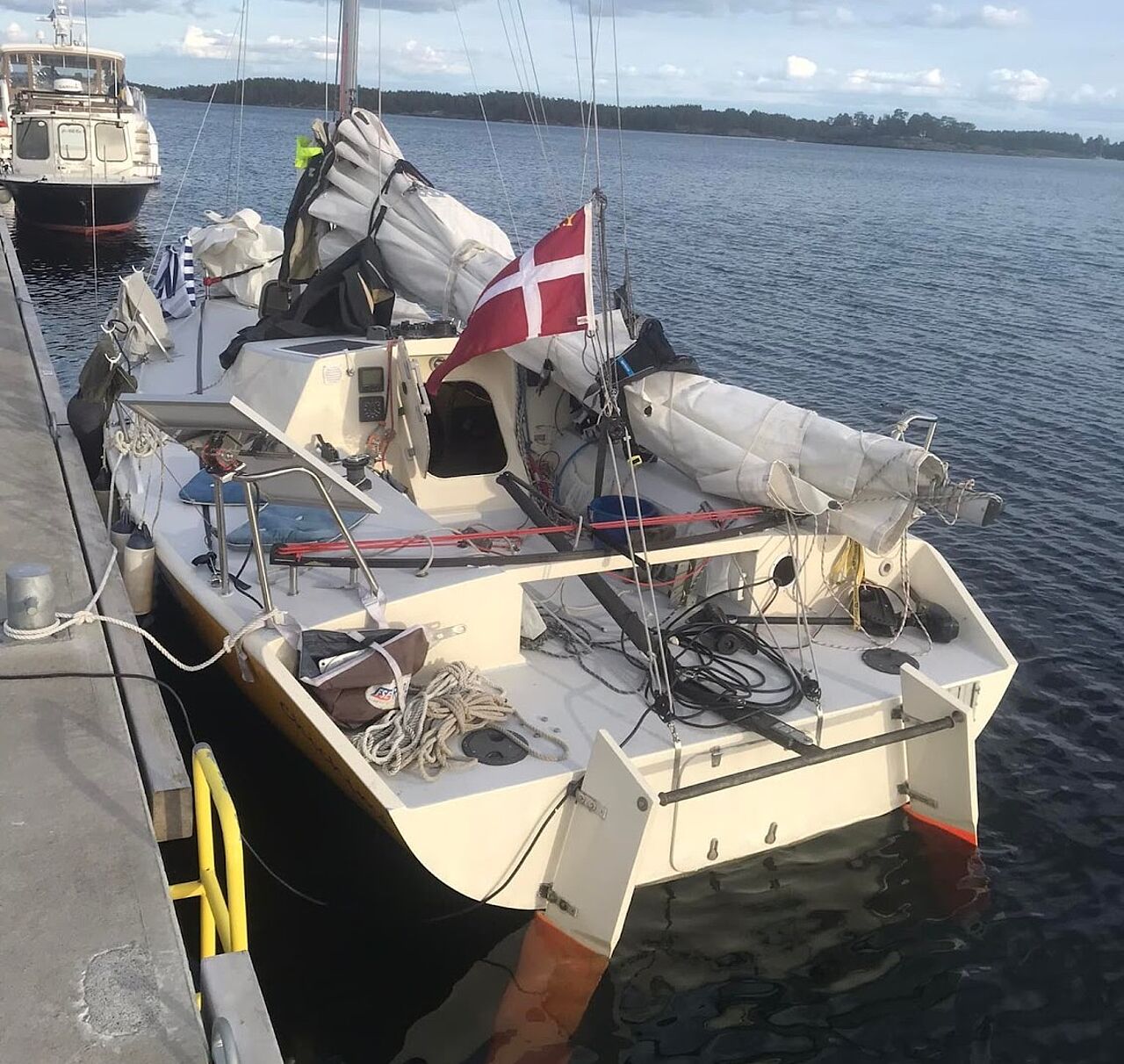 Det lyder næsten som en overdrivelse, men sådan sejler en Mini 650. Voldsomt overrigget, bygget til at krydse Atlanterhavet solo – og alligevel stod jeg pludselig i en lille svensk skærgårdsmarina og så min kommende båd rage 12 meter op over nabobådene.