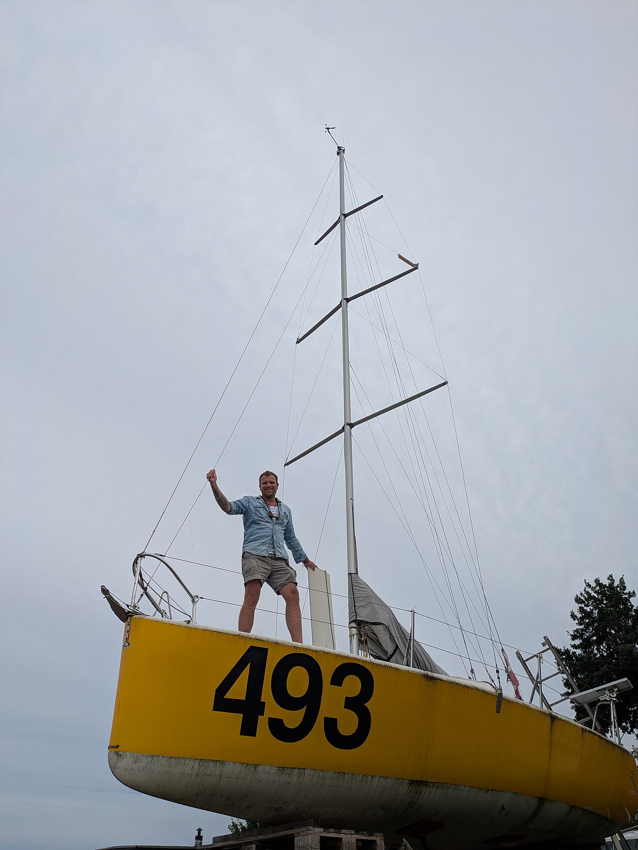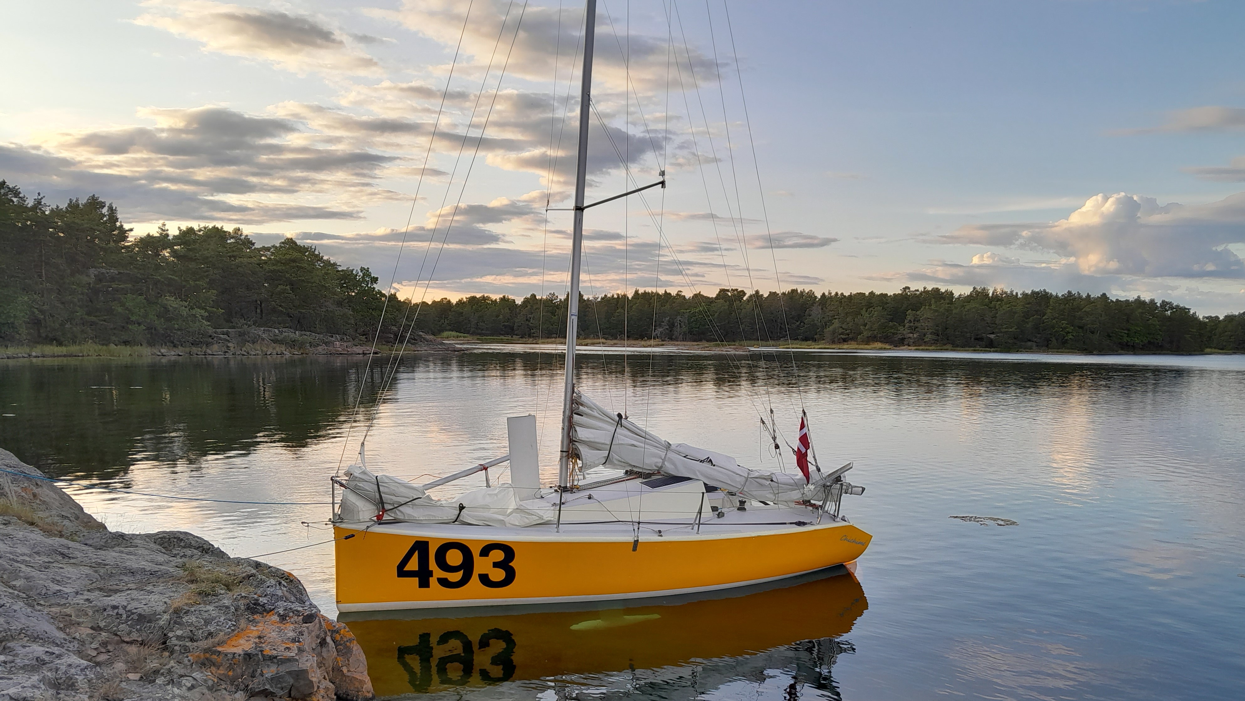 Vi kørte en time ud i skærgården, gennem et landskab af gran, birk og skær – som taget ud af en Evert Taube-vise i mol. Og dér, mellem de små svenske både, tronede hun: et korngult skrog med store sorte numre på siden, en mast med tre sæt salingshorn ragende 12 meter op – uforholdsmæssigt høj for en båd med kun seks meter vandlinje.