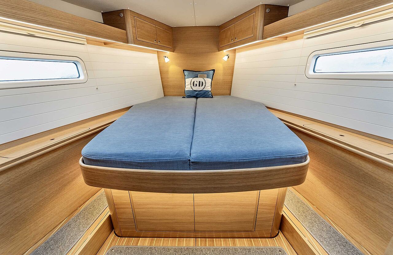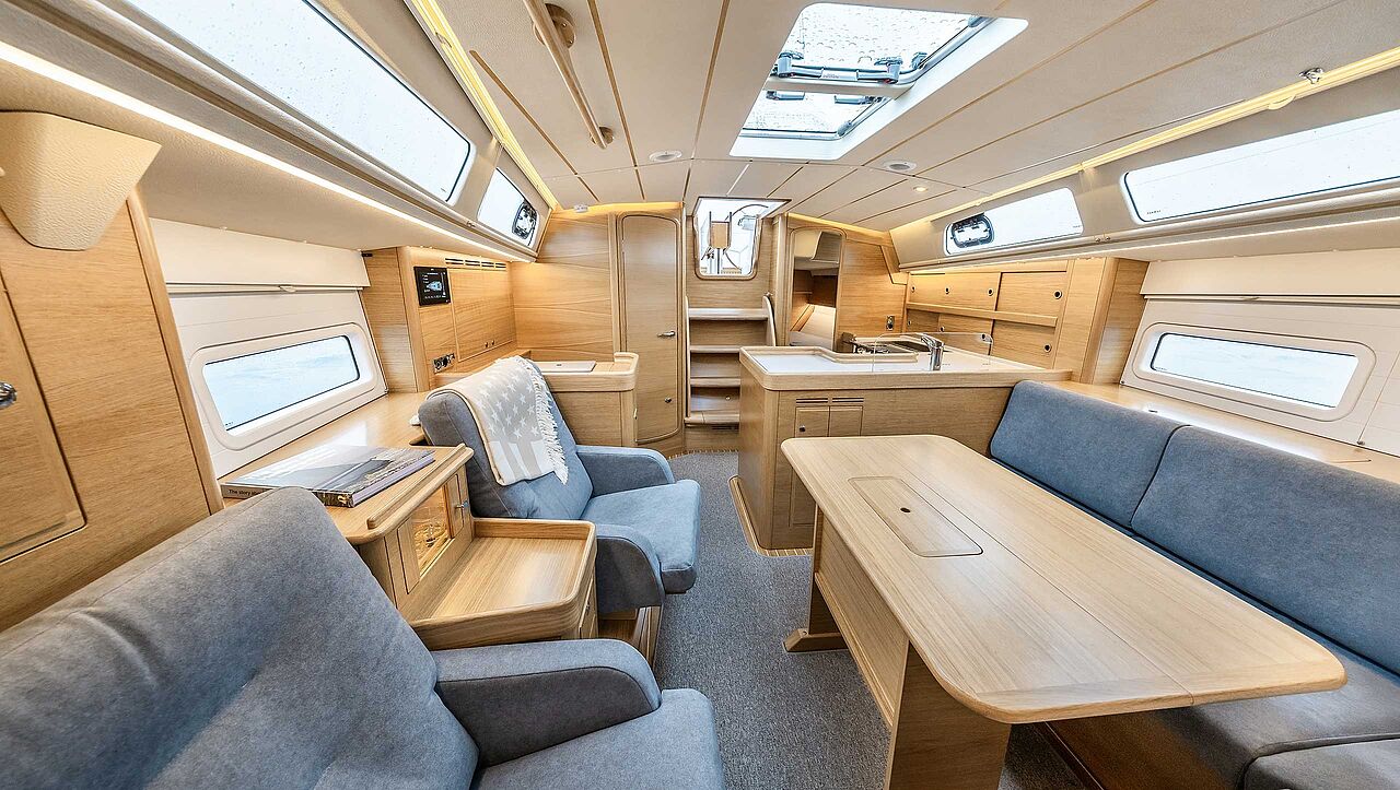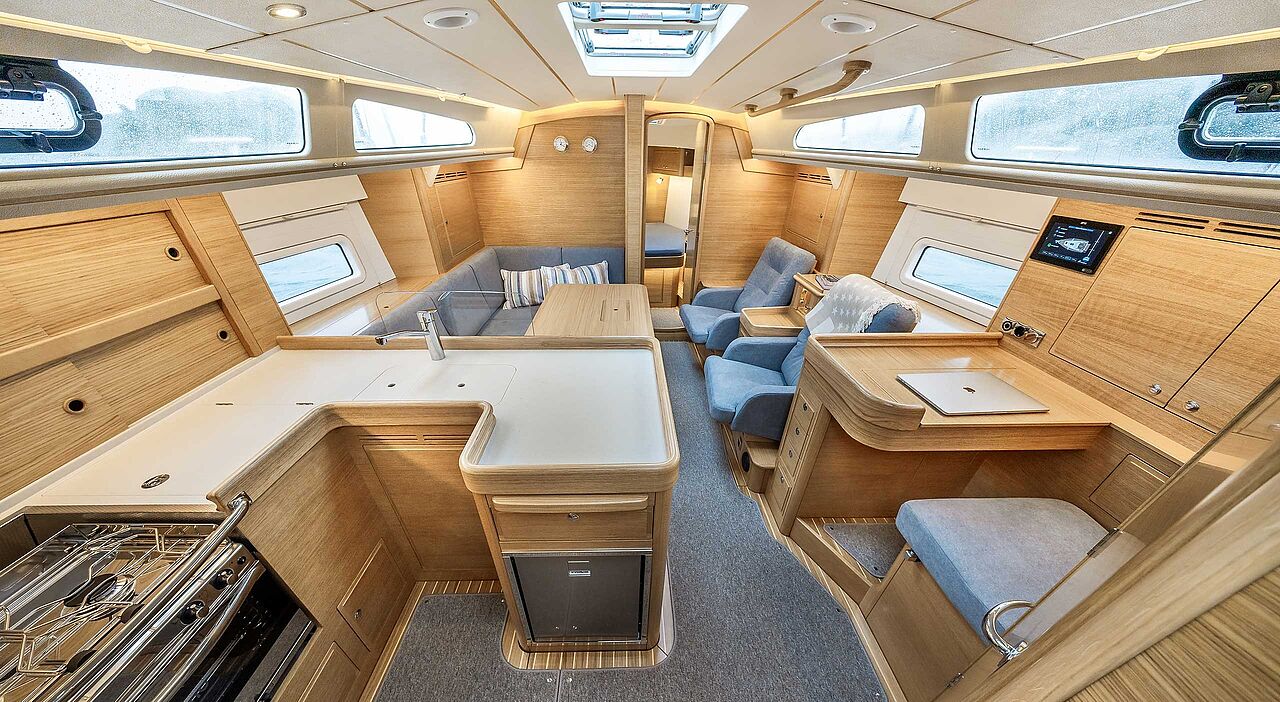 Under dæk afslører den moderne skrogform et markant løft i både plads og lys. For første gang i denne bådstørrelse tilbyder Hallberg-Rassy de ikoniske lænestole i salonen, midterskibs dobbeltseng i ejerkabinen og mulighed for ekstra køl eller opvaskemaskine i pantryet.