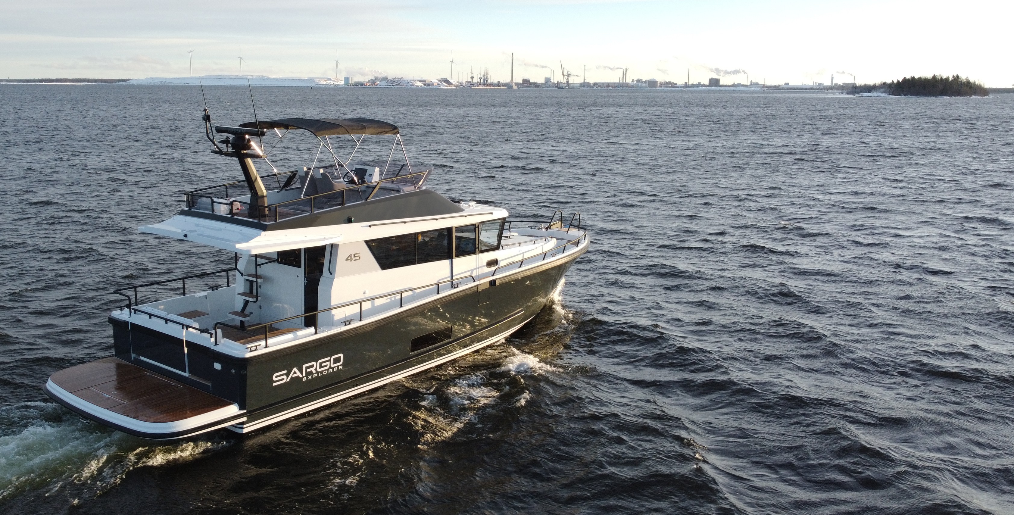 Den finske producent byggede videre på Sargo 45 fra 2023 og løftede konceptet med en fuldt integreret flybridge – uden at give køb på sikkerhed, helårsbrug og det robuste offshore-DNA, som mærket er kendt for.