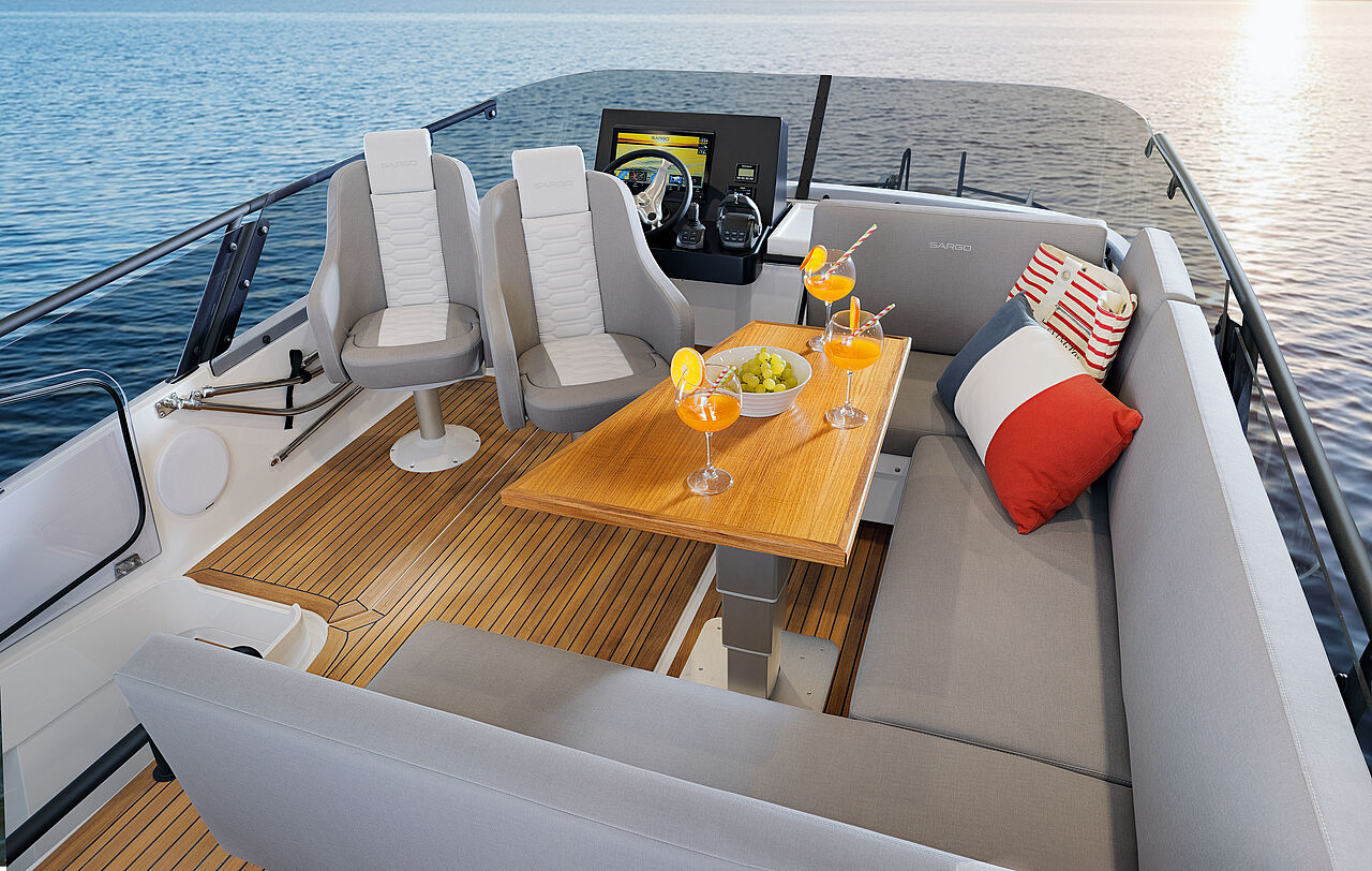 Sargo 45 Flybridge var udviklet over halvandet år med fokus på pladsudnyttelse og produktionsoptimering. Resultatet blev en reel ekstra styreplads og et opholdsareal under åben himmel – uden at stjæle lys eller volumen fra styrehuset.
