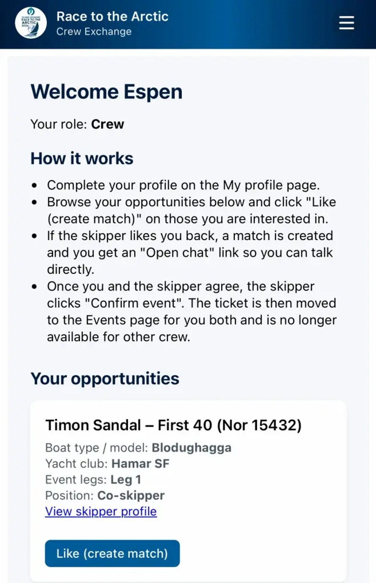Sejlere og bådejere opretter profiler med erfaring, ambitioner og tilgængelighed. Herefter kan parterne “like”, chatte og vurdere hinanden, før der tages kontakt. Formatet gør det muligt at finde mandskab til hele regattaen, enkelte etaper eller retursejladsen fra Lofoten.