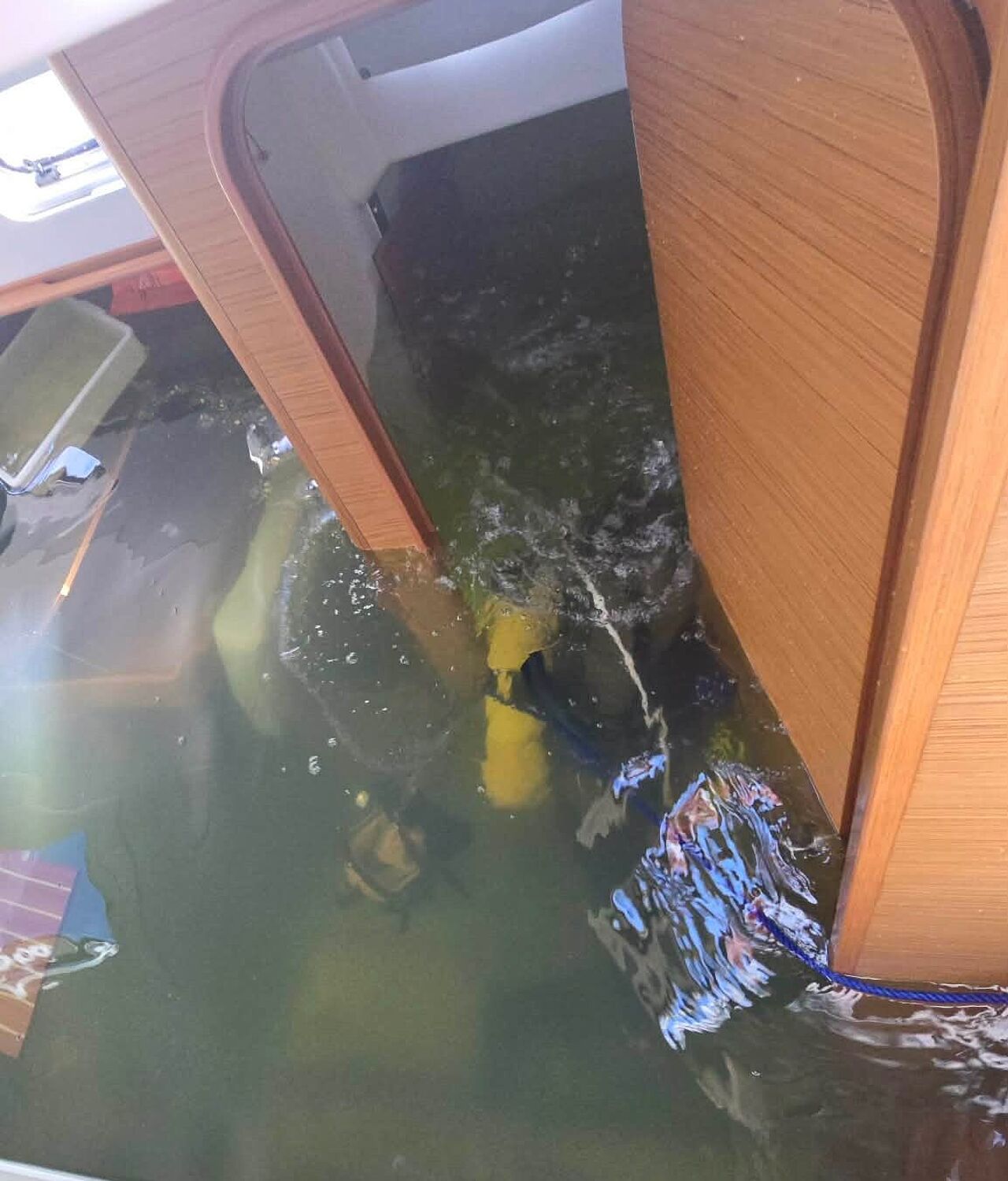 - Sejlbåden stod på havbunden og havde taget så meget vand ind, at der stod 1,5 meter vand inde i båden.