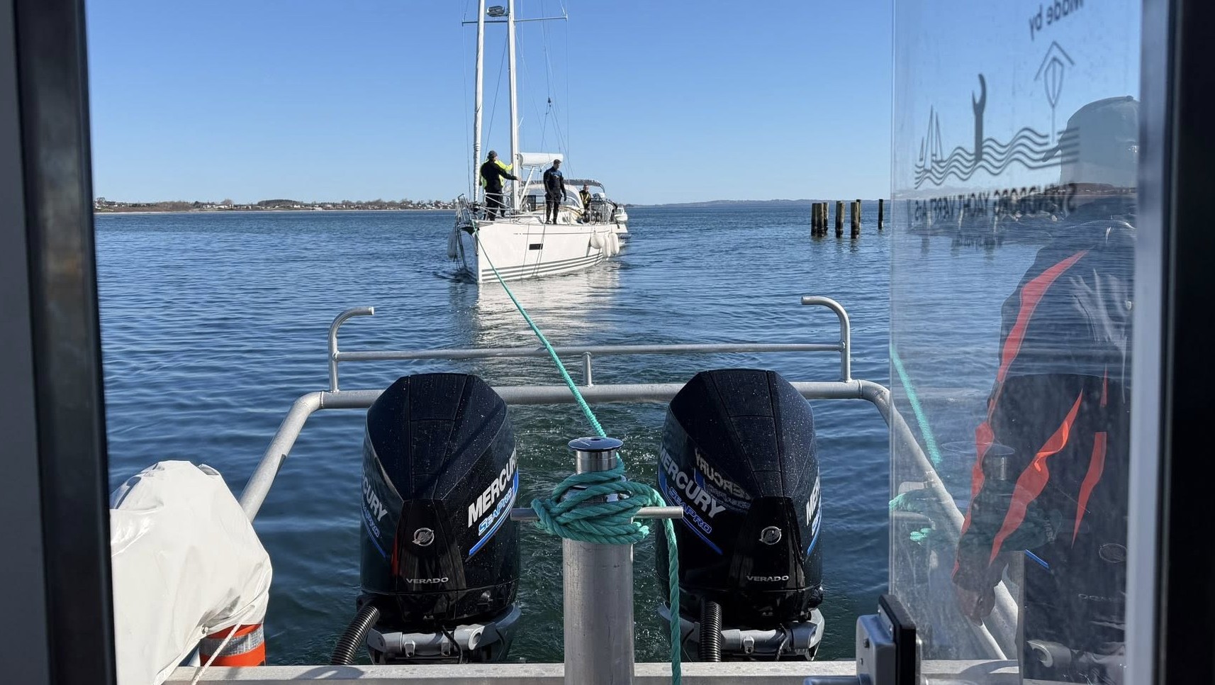 På grund af lavvande måtte redningsfolkene bruge en utraditionel metode for at få båden fri. Den blev trukket løs med masten som krængningspunkt, inden den kunne bugseres ind til kranen.