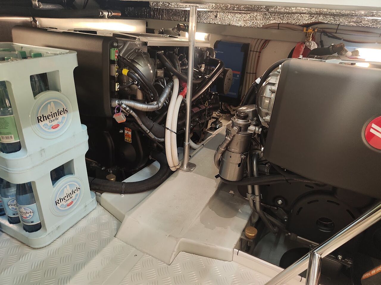 Standardudstyret er omfattende og vidner om en båd, der er klar til brug fra dag ét. Blandt højdepunkterne er stor badeplatform med integreret stuerum, dieselvarme, bovpropel, Corian-bordplader, defroster, elektriske lænsepumper, vendbart passagersæde, flybridge-kalesje, trimplan og separat bruserum med ventilation.