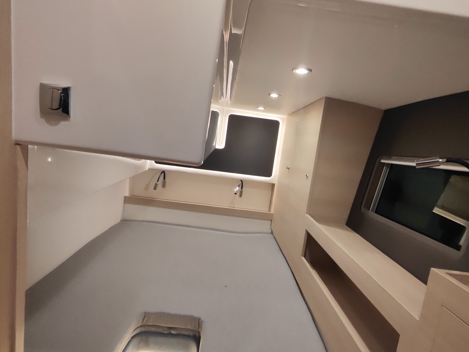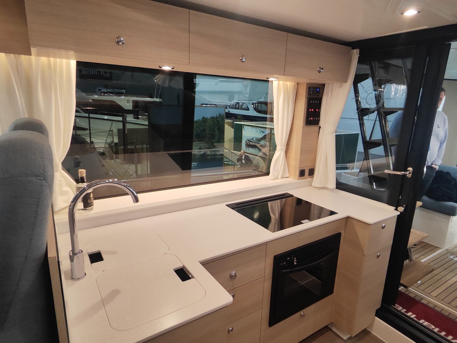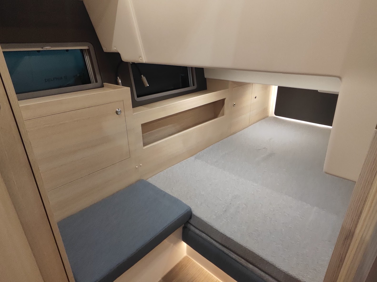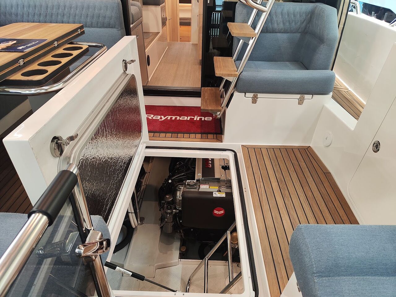 Under dæk finder man tre regulære kahytter samt separat toilet- og bruserum. Salonen er rummelig og badet i dagslys, og med skydedør samt hæve-/sænkevindue i glas mellem salon og agterdæk skabes der en flydende overgang mellem ude og inde. Cockpittet opleves dermed som en integreret del af opholdsrummet – også i nordiske forhold.