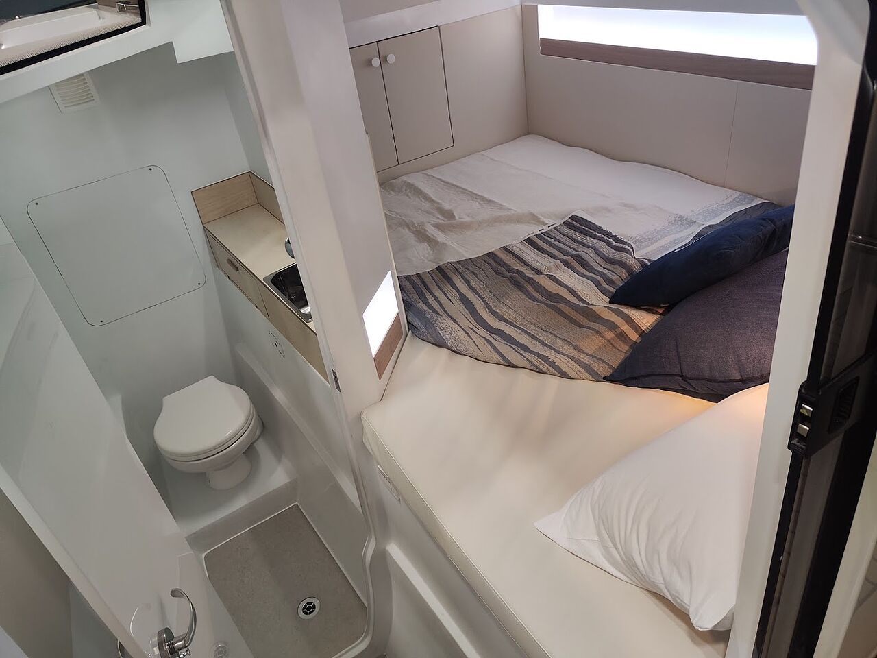 Lasai 32 KS er bygget som katamaran med to smalle skrog, der reducerer vandmodstanden markant. Det er en velkendt fordel i teorien, men i praksis er det netop denne egenskab, der gør forskellen for elbåde.