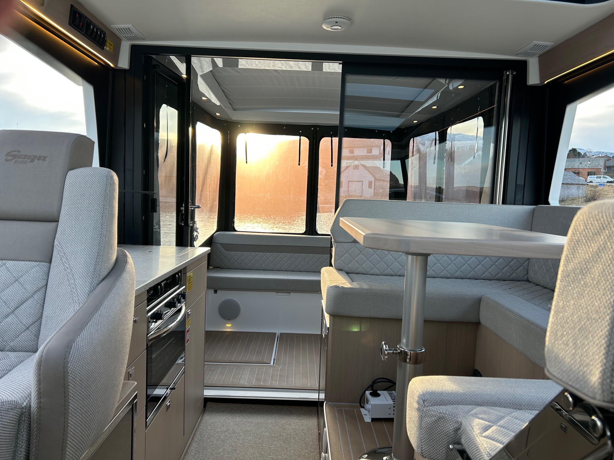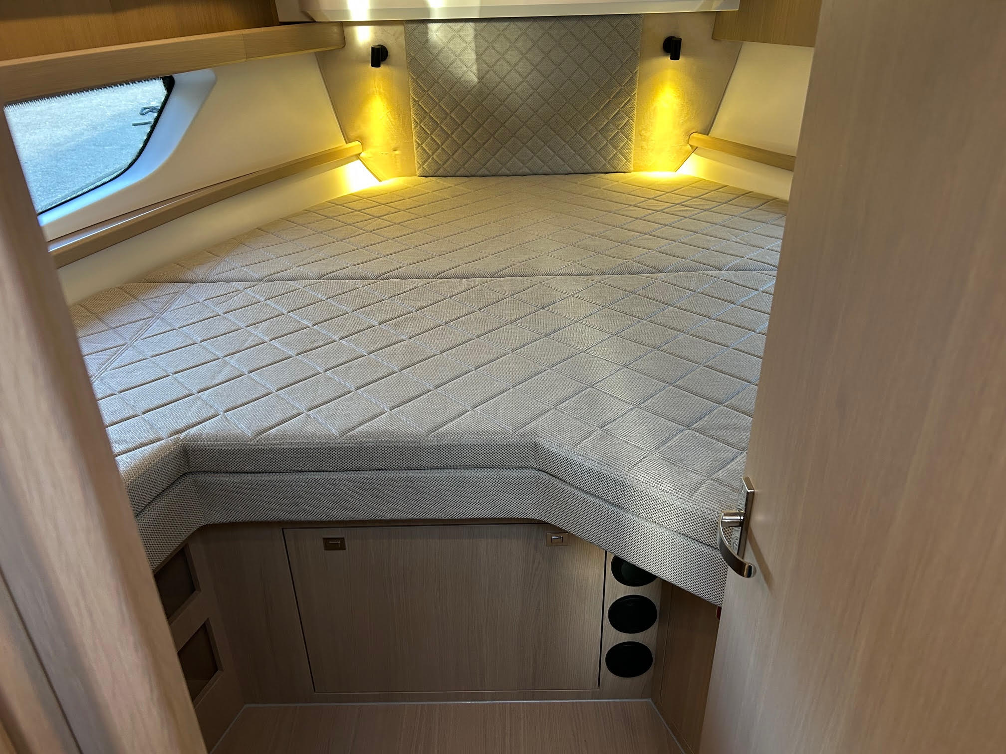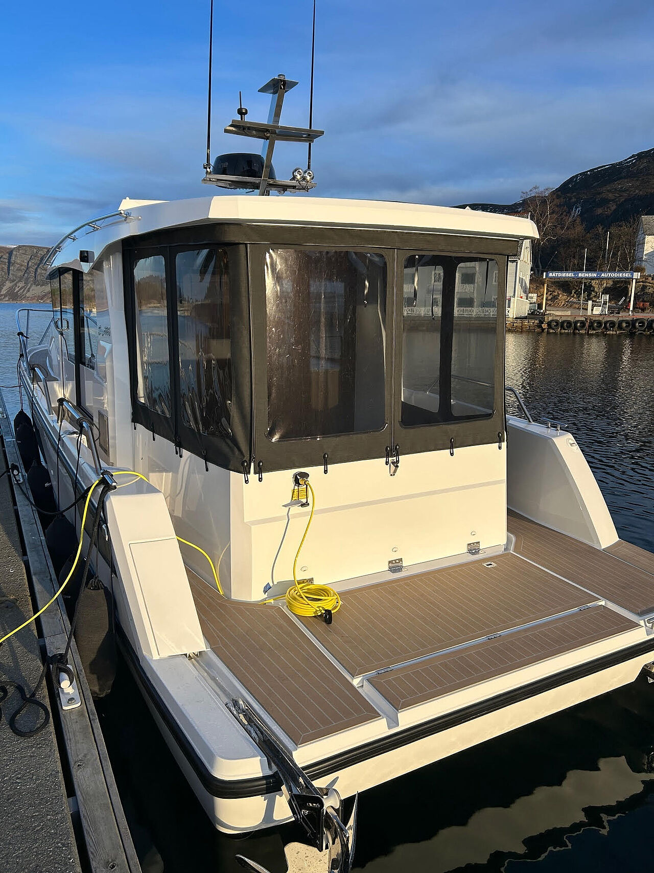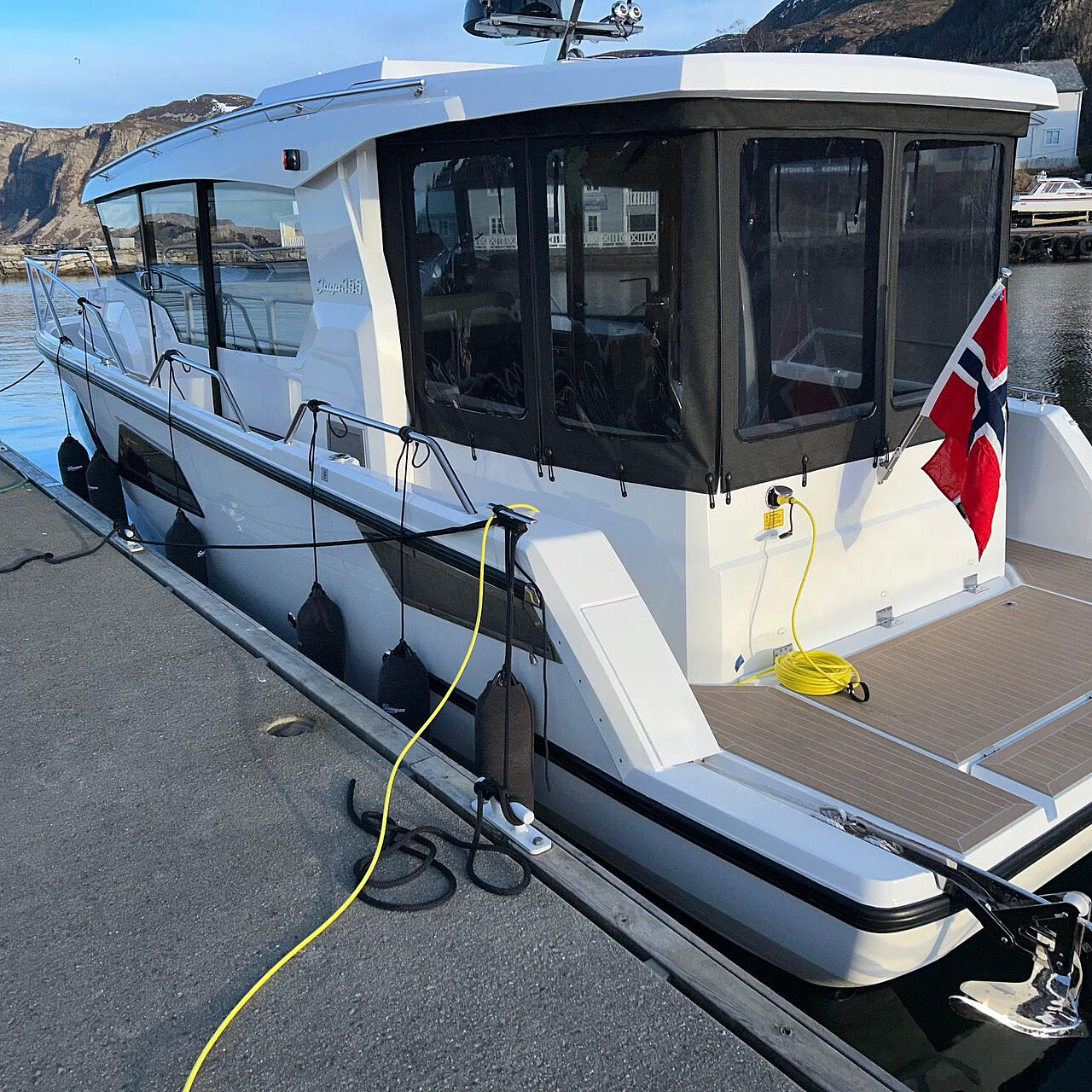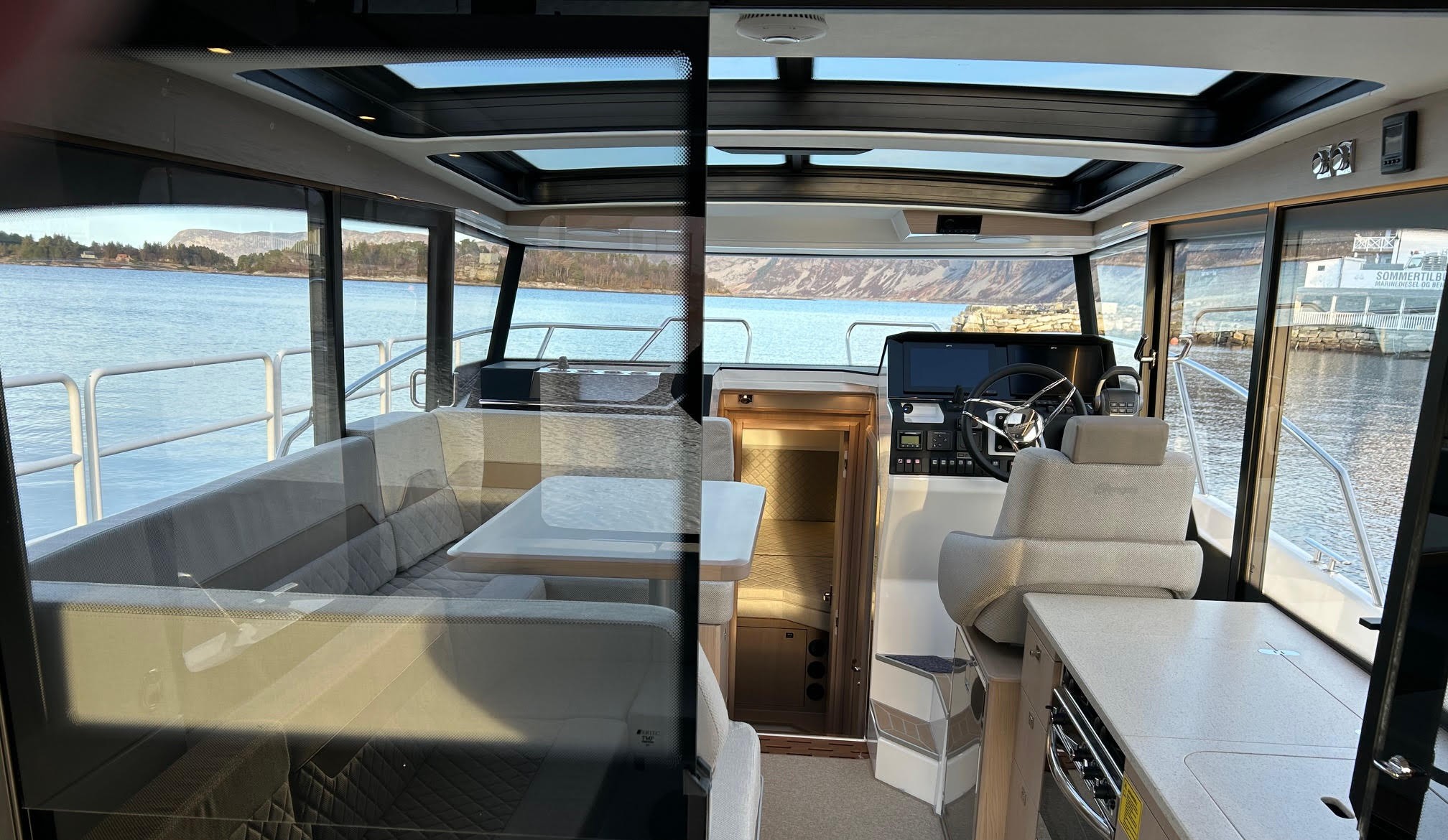 Sidedøre i begge sider gør fortøjning nem og sikker, og walkaround-dækket giver tryg adgang rundt om båden. Agterdæk og salon ligger i samme niveau, hvilket giver en praktisk og niveaufri overgang.