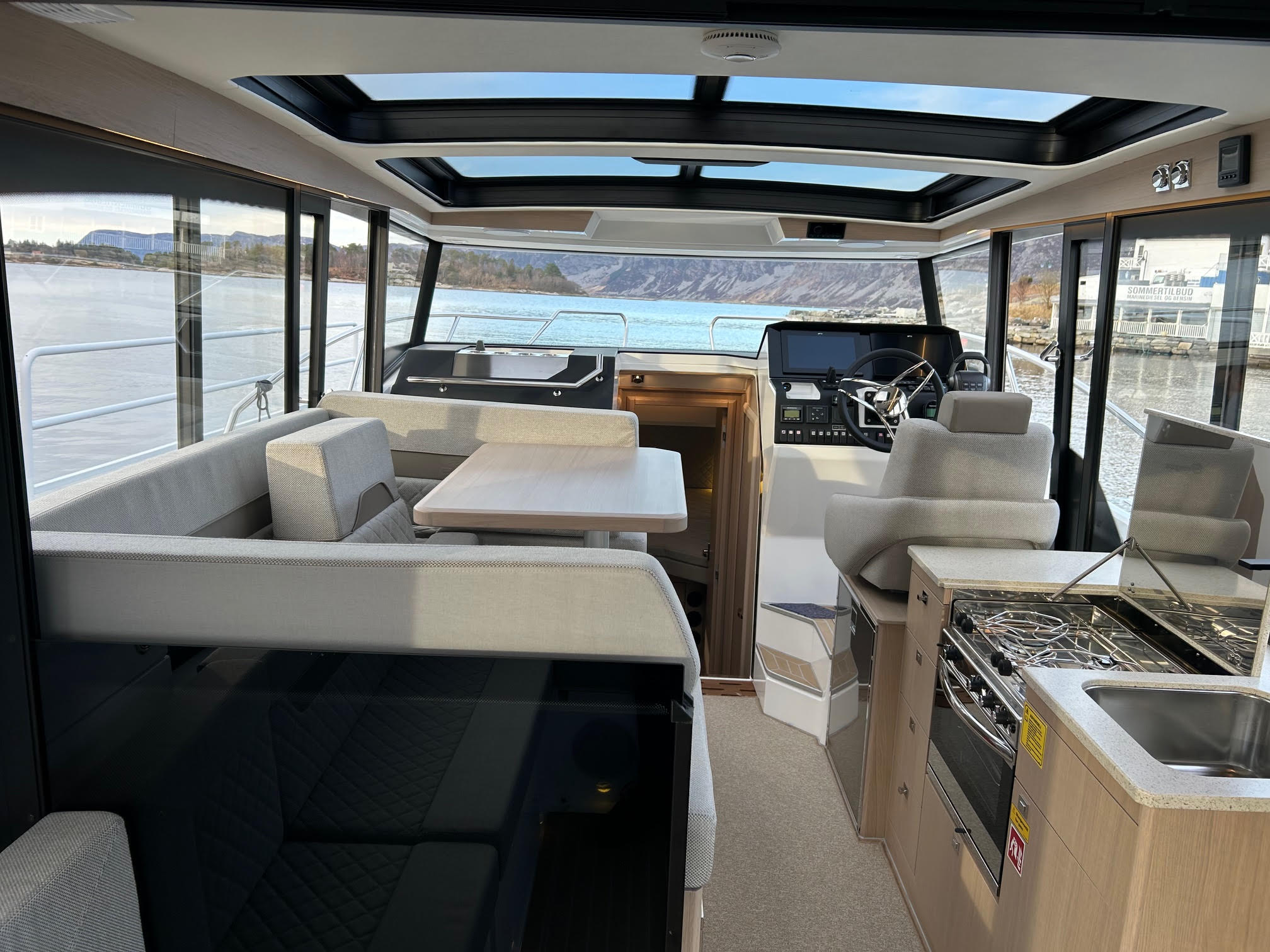 Dæksalonen er bådens centrale opholdsrum med store vinduesflader, der giver masser af lys og panoramaudsigt. Den rummelige U-sofa skaber gode rammer for ophold og samvær, mens førerpladsen er ergonomisk udformet med godt overblik og intuitive instrumenter.