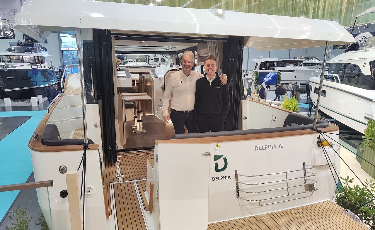 Den meget rummelige Delphia 12 Sedan, bygget i Polen, måler 12 meter i skroglængde (13,40 meter overalt) og er designet af Andrzej Skrzat i samarbejde med Tony Castro Yacht Design. Resultatet er en moderne motorbåd med rene linjer og fokus på funktionalitet.