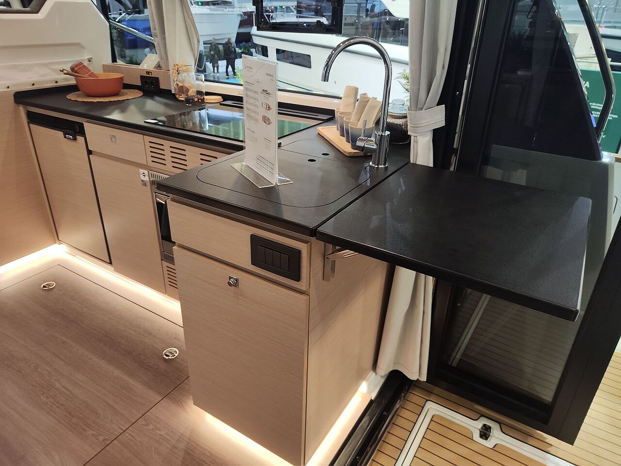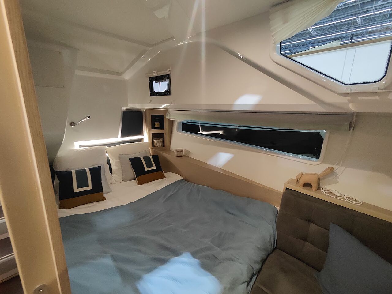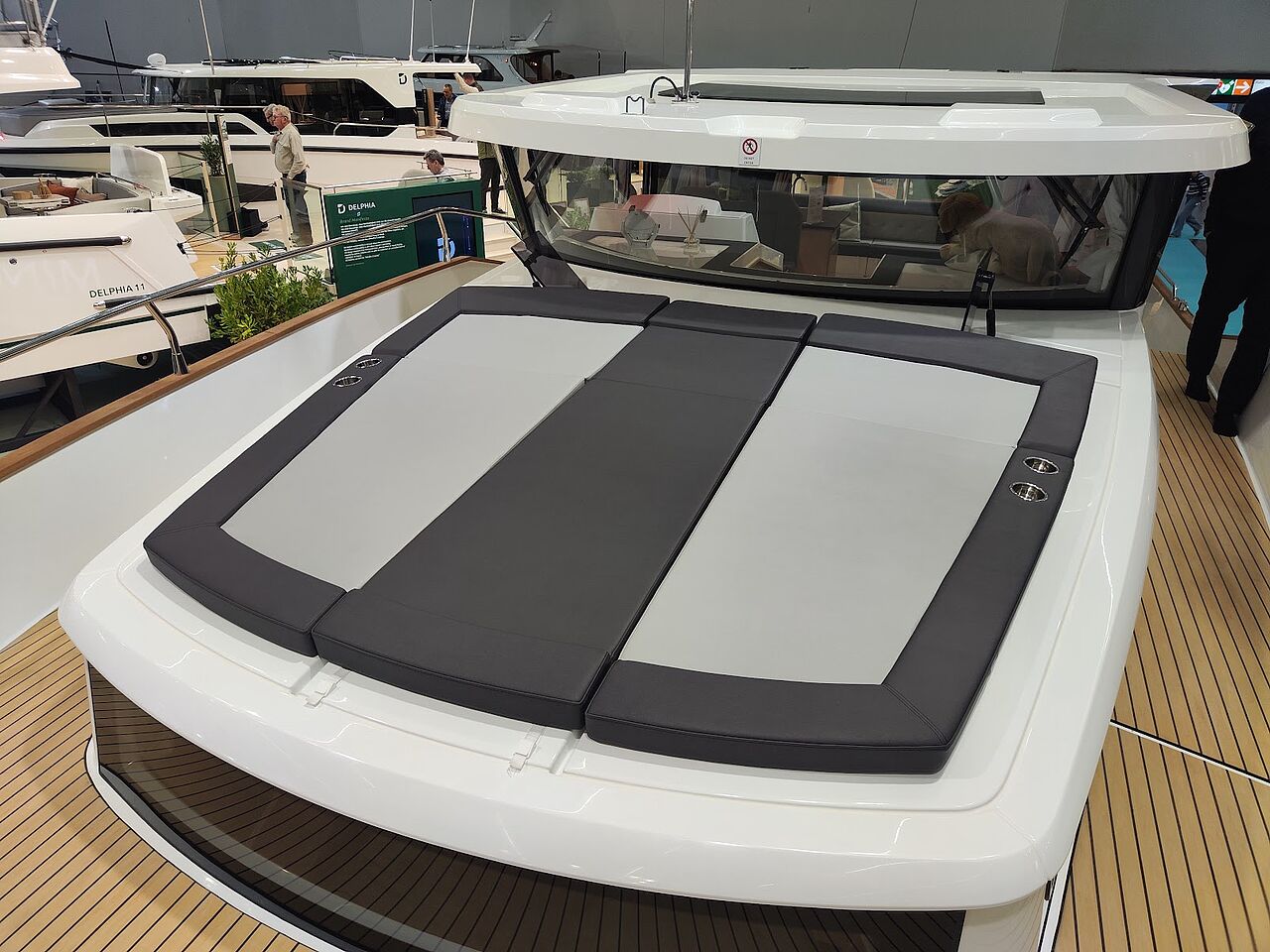 Som ekstraudstyr kan båden leveres med solceller, der forlænger opholdene for anker og reducerer behovet for landstrøm – endnu et element i Delphias fokus på selvforsyning og rolig sejlads.