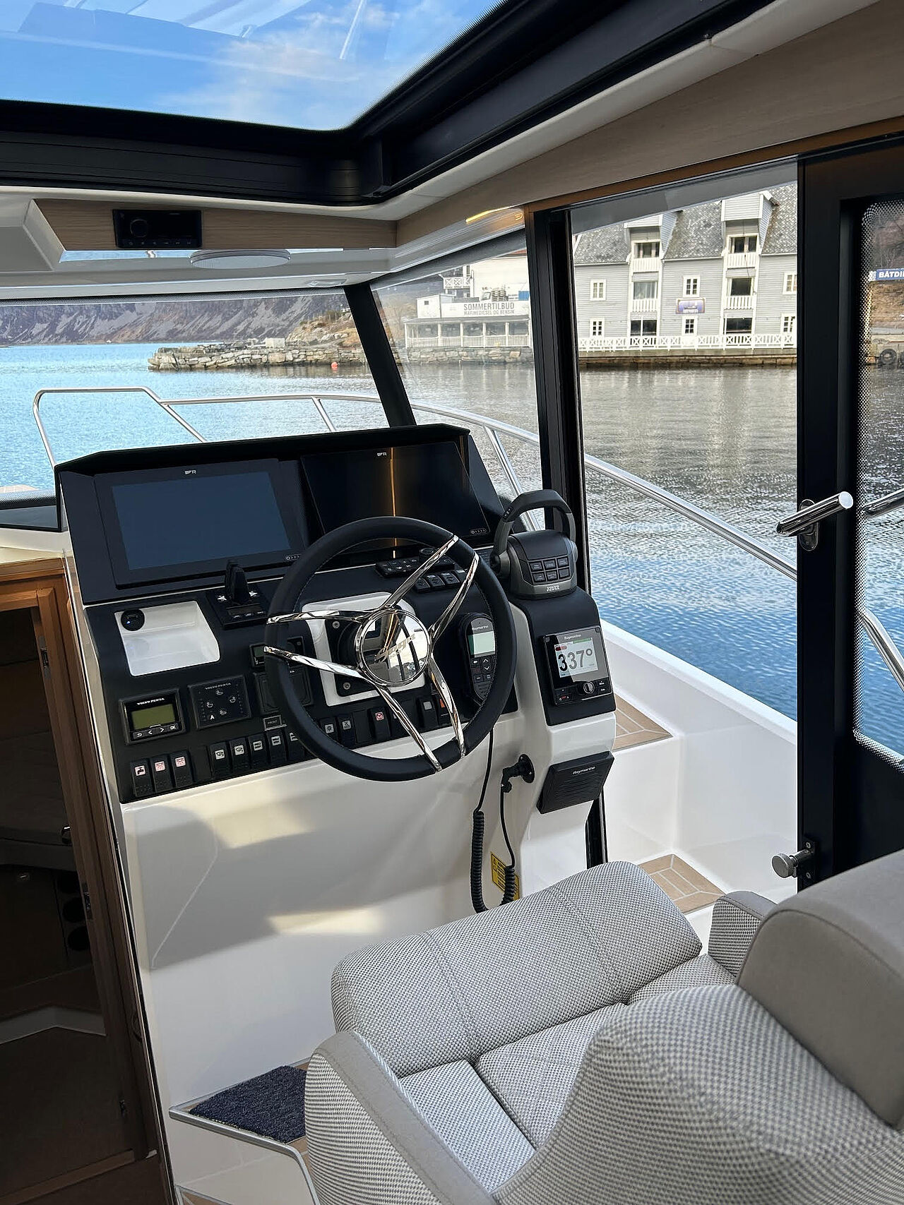 Dæksalonen er bådens centrale opholdsrum med store vinduesflader, der giver masser af lys og panoramaudsigt. Den rummelige U-sofa skaber gode rammer for ophold og samvær, mens førerpladsen er ergonomisk udformet med godt overblik og intuitive instrumenter.