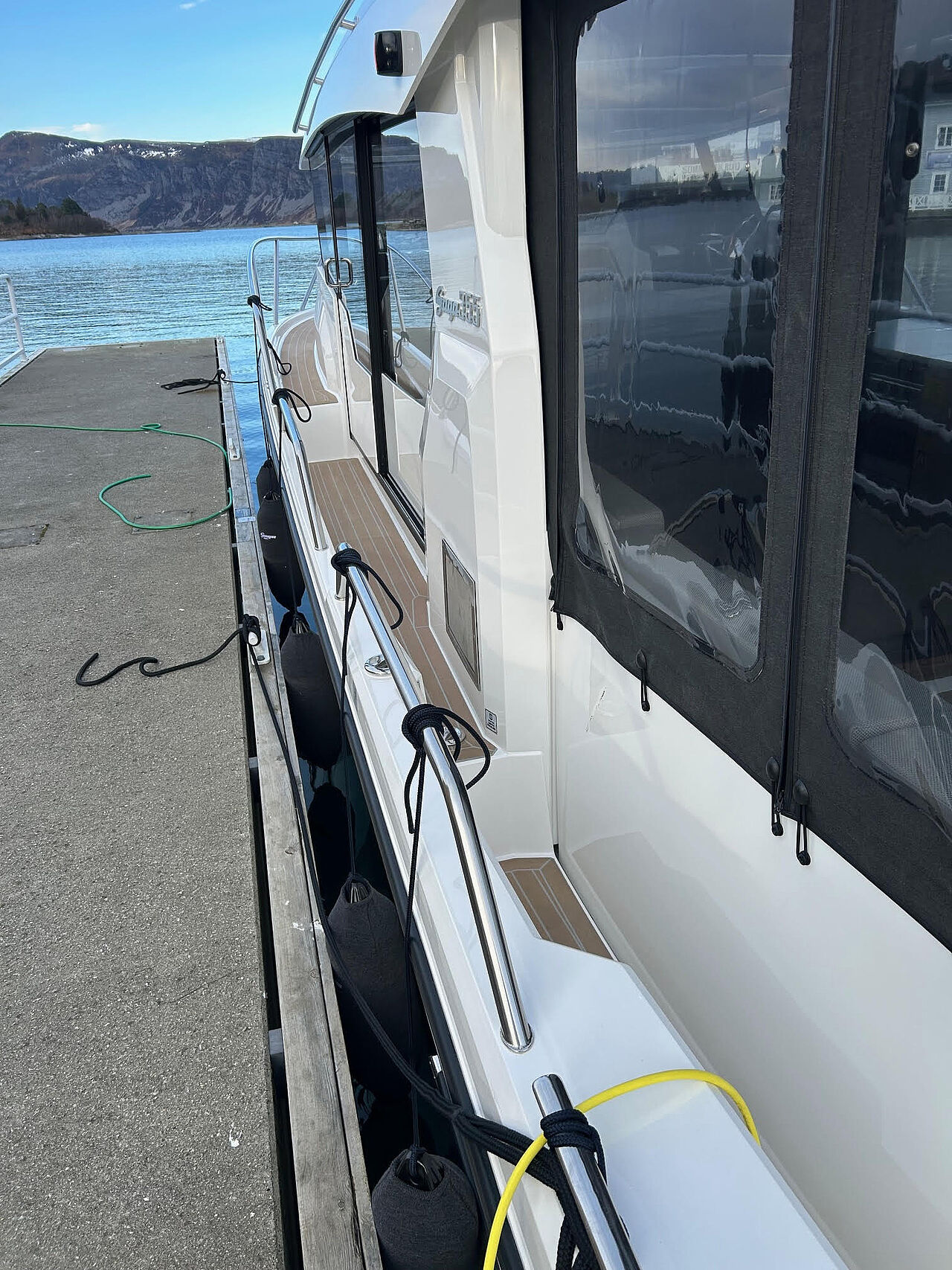 Sidedøre i begge sider gør fortøjning nem og sikker, og walkaround-dækket giver tryg adgang rundt om båden. Agterdæk og salon ligger i samme niveau, hvilket giver en praktisk og niveaufri overgang.