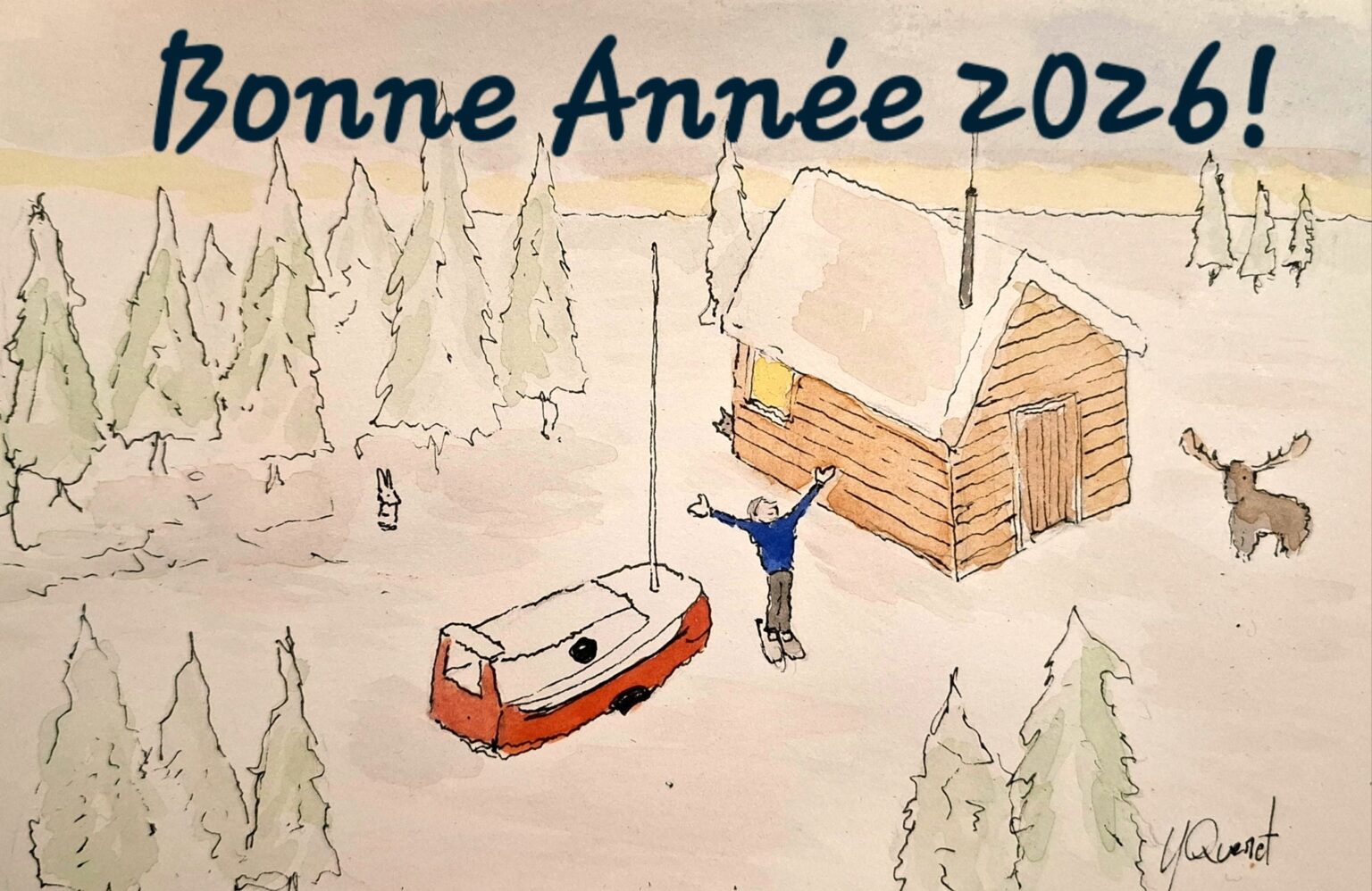 Yann Quenet befinder sig i regionen Abitibi-Témiscamingue, hvor vinteren har været hård. I flere måneder lå temperaturerne under frysepunktet, og båden forsvandt under massive snemængder. Et kort tøvejr har efterladt isen som en ujævn, frossen masse.