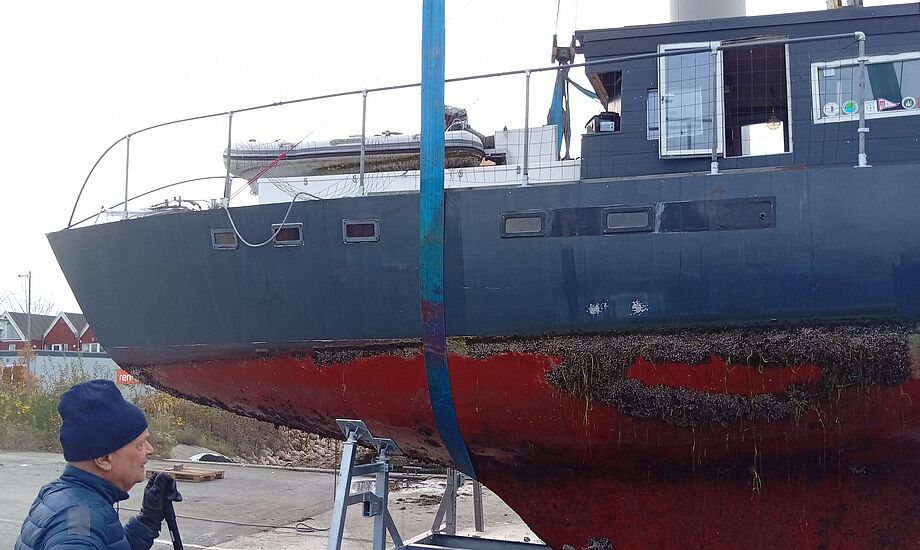 Planen var klar, men det drillede. Beslaget sad forkert, kunne ikke sænkes langt nok, og der var ingen huller til kabler. Jeg lå i en gummibåd i utætte gummistøvler og arbejdede i kulden i en fremmed havn uden plads. Jeg tabte værktøj i vandet og kørte flere gange til Køge Bugt for at hente reservedele. En aften måtte jeg låne specialværktøj i Frederiksværk. Først efter fire hårde dage og to afbrudte afsejlingsforsøg var vi klar.