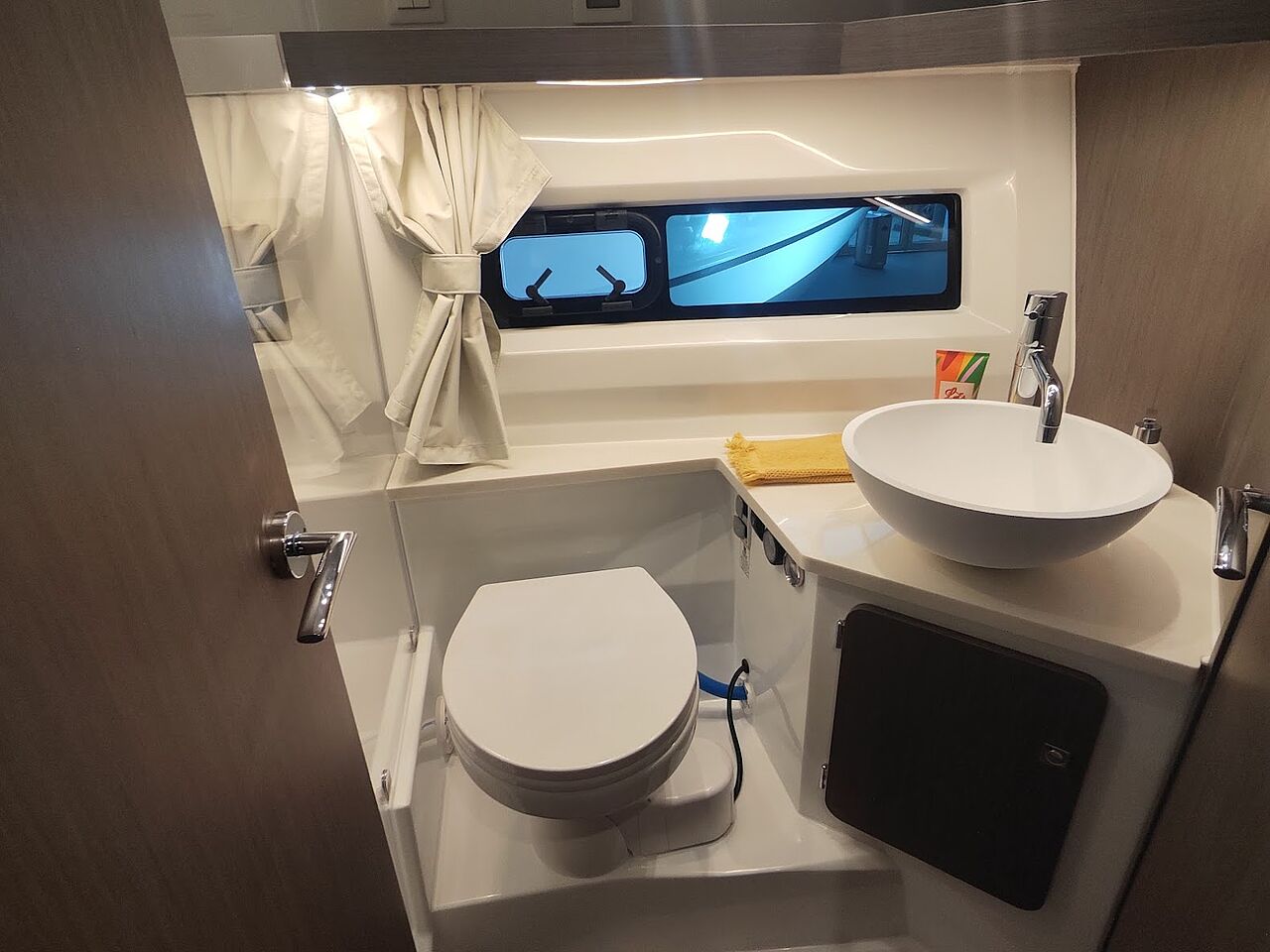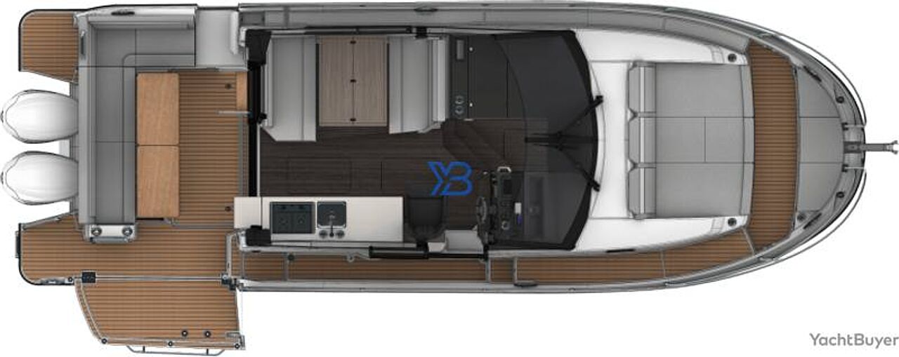 Det mest iøjnefaldende element er den foldbare terrasse i styrbord side agter. Når den åbnes, udvider cockpittet sig markant og skaber en direkte forbindelse til vandet.